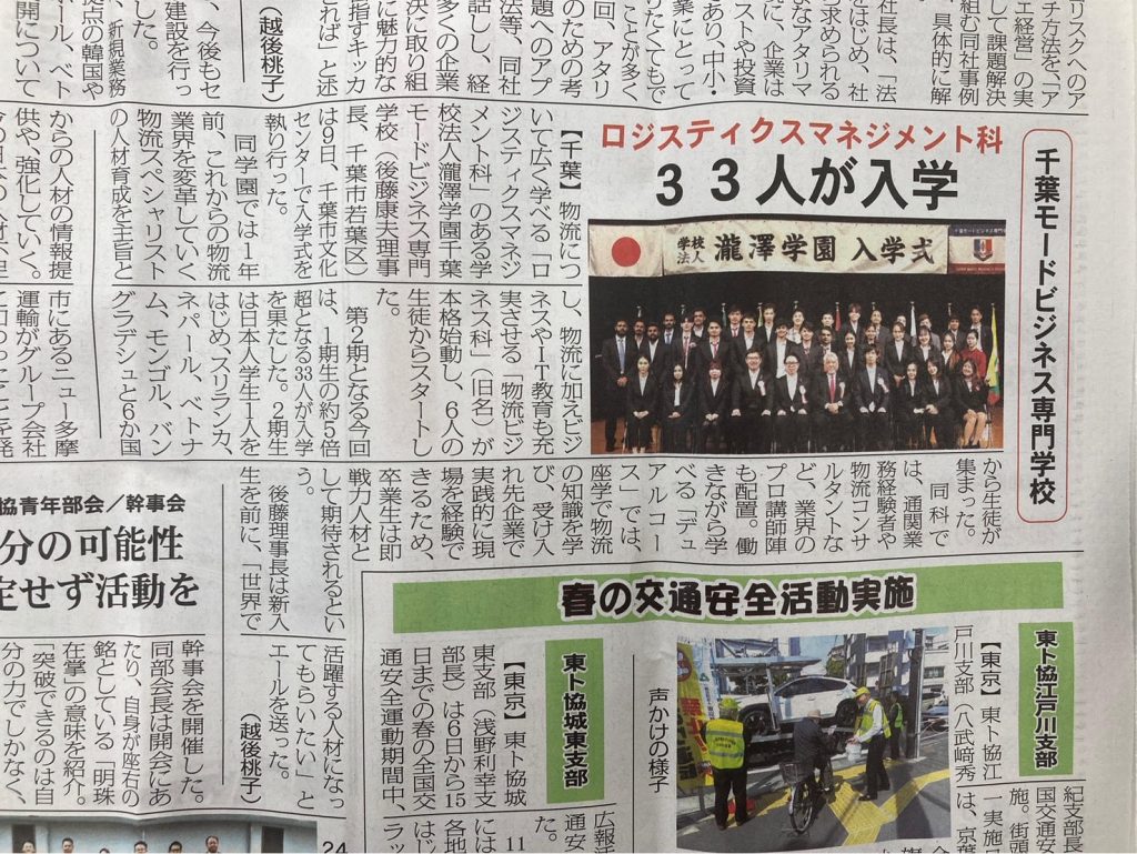 ロジスティクスマネジメント科が新聞で紹介されました Uncategorized 2024.04.26 2期生の入学式の様子が物流ウィークリーで紹介されました。 「ロジスティクスマネジメント科」は2024年4月科名変更しました。ロジスティクスマネジメント科 (旧科名「物流ビジネス科」)