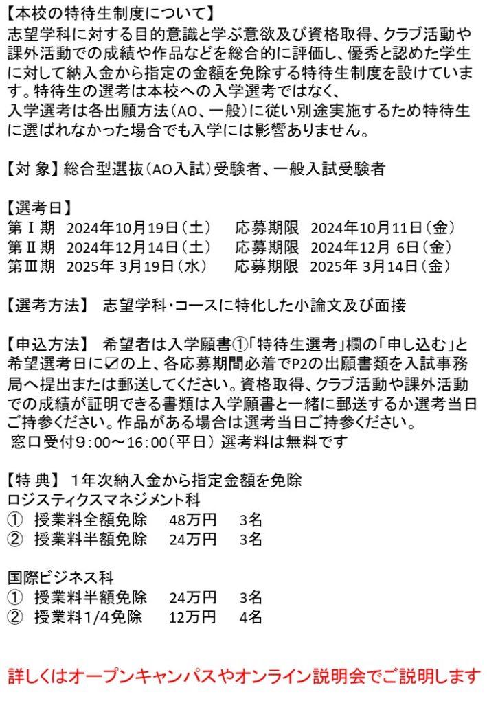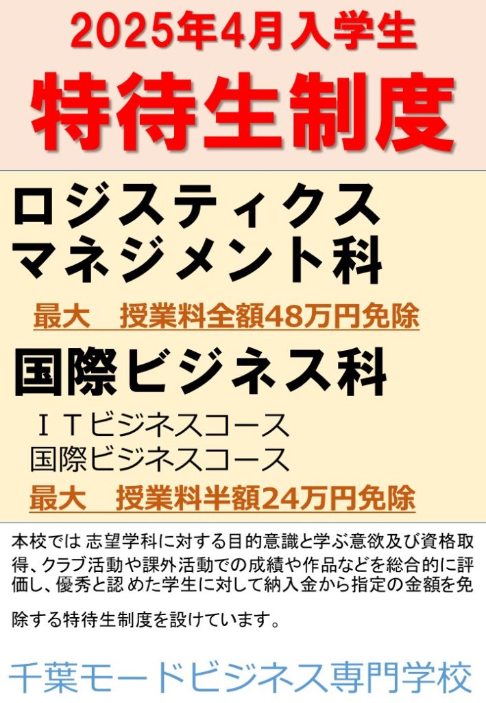 2025年4月入学生 特待生制度について Uncategorized 2024.03.29 高校生、高校既卒者対象 千葉モードビジネス専門学校では学ぶ意欲がある方を支援するためにロジスティクスマネジメント科、国際ビジネス科で「特待生制度」を実施しています。詳しくはオープンキャンパスなどでご説明します